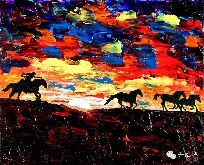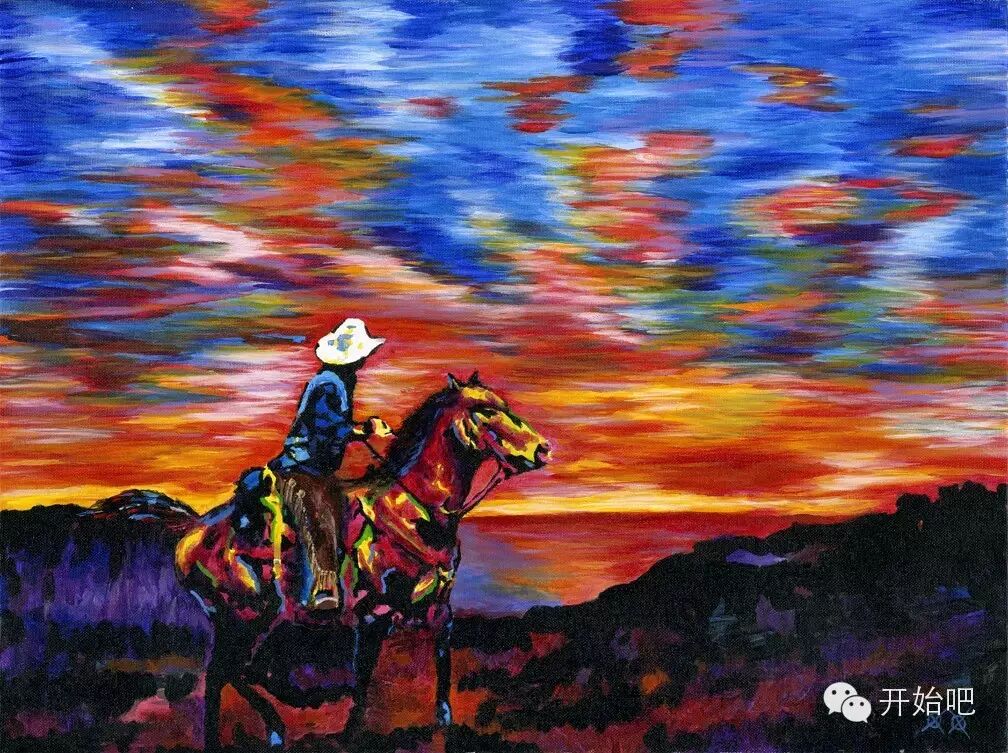 画他记忆中德州飞奔的野马。