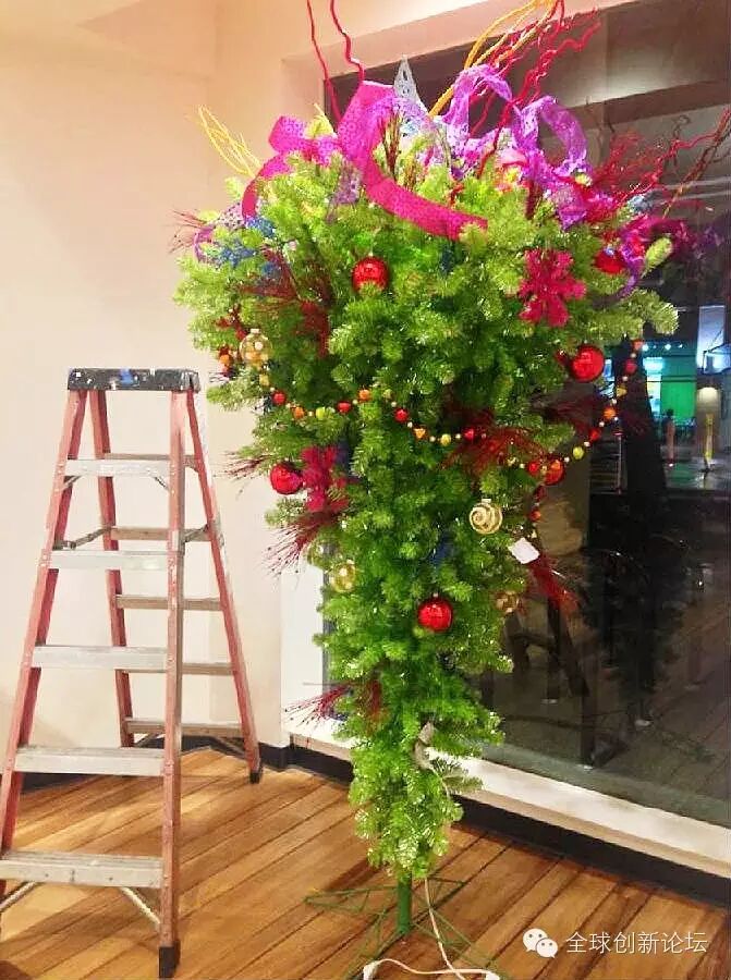 现在大家都在讲颠覆式创新,我们在采访过程中拍了一组非常有意思的照片,在美国圣诞节期间不管是公司还是家里,很多地方都会竖起一棵圣诞树。但是这棵Draper大学的圣诞树是倒过来的,要表达一个颠覆世界的理念。