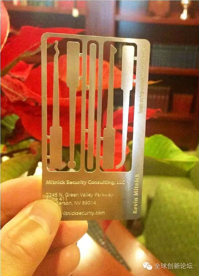 Kevin Mitnick这是世界头号黑客,他是在历史上非常传奇的一个人物,他是当年被美国连邦调查局通缉的一个江洋大盗,那时候没有现在的互联网,没有现在的无线互联网的移动技术,他搞黑客的活动主要靠电话、靠上网的猫。看得出来这个名片是什么东西吗?这是一个金属的名片,这是一个撬锁的工具,把上面的金属片卸下来以后可以撬锁。他虽然现在不做黑客了,专门给很多互联网公司做系统安全的顾问,但是你可以看出来这个小子还是贼心不死,交换的名片都是一个撬锁的工具。因为Kevin以前犯过罪,所以他被关起来的时候,当时法律上禁止他出书,法律要求一个人要经过十年、五年之后才可以从自己的犯罪历史中谋取利益,所以他开始他换了一个角度写了一本书《欺骗的艺术》,他被放出来以后写了三本书,每一本都获得了很大的成功。在Kevin Mitnick看来,互联网的历史上如果没有黑客的精神,就不会有互联网的今天,纵观互联网历史的发展,不管是Facebook还是比特币这样创新的东西,实际上都是靠我们黑客打破常规的精神去推动的。